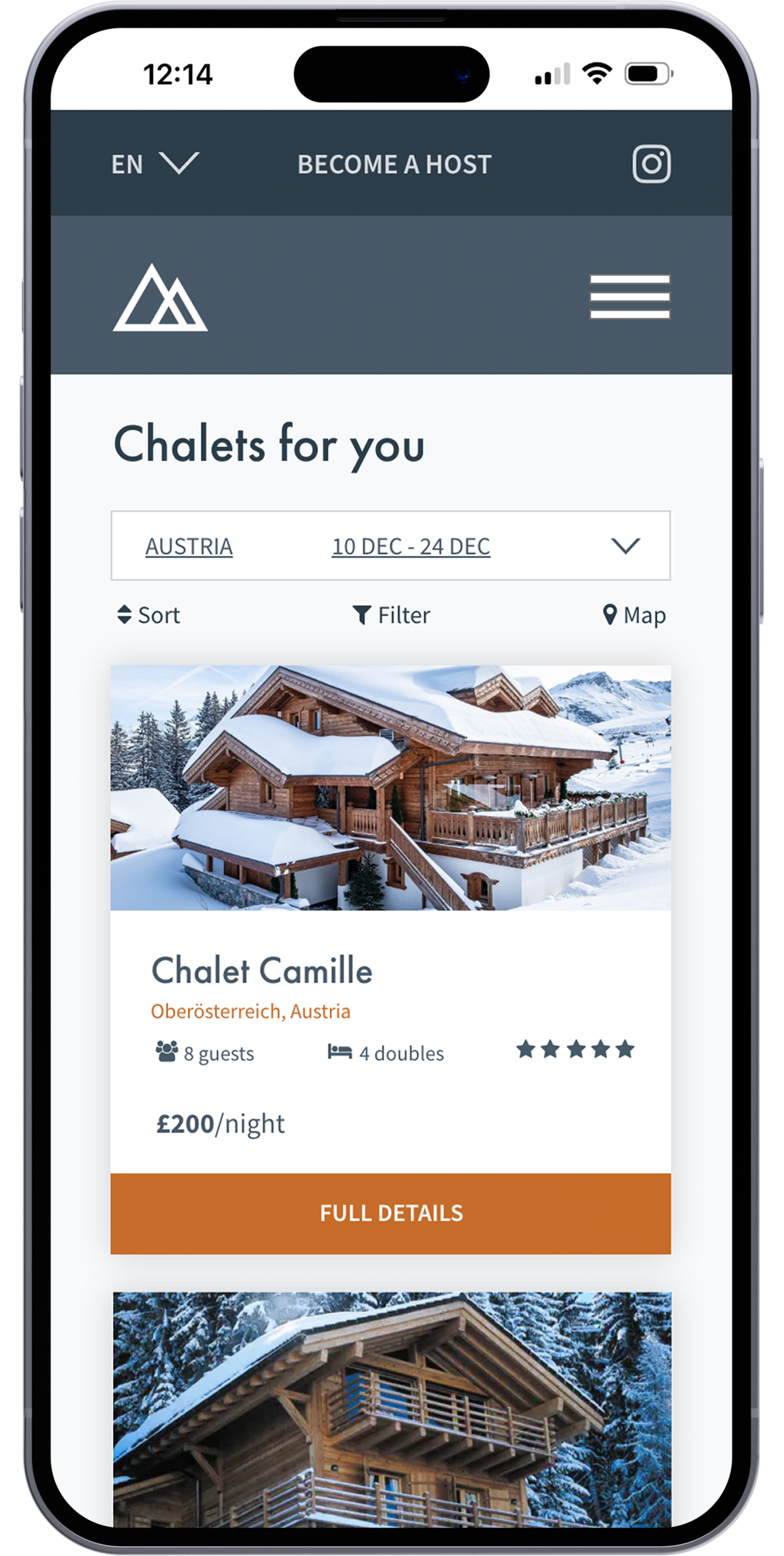 Filtered results displayed clearly and accessibly, helping users browse available chalets that match their destination and dates.